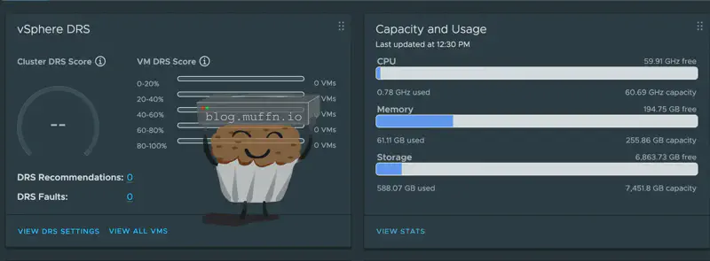 DRS and HA work (more on how I know this below). DRS is unfortunatly not that exciting, despite asking the cluster to balance VMs evenly across hosts, I have more than enough resources on one host to run most of my VMs so one host always has most of the workload, but that’s fine.