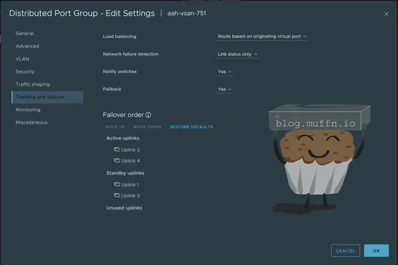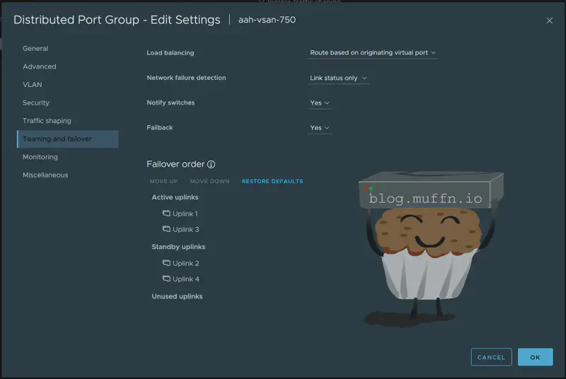 In order to use both NICs for vSAN traffic but to also use these for management and VM traffic, everything must be on the same vDS. To do this, I have one vDS with both 10Gb/s NICs connected to it, with 2 VLANs created for vSAN traffic. In the port group settings for the vSAN PGs, I have the ’teaming and failover’ set to use different active/standby uplinks for each PG.