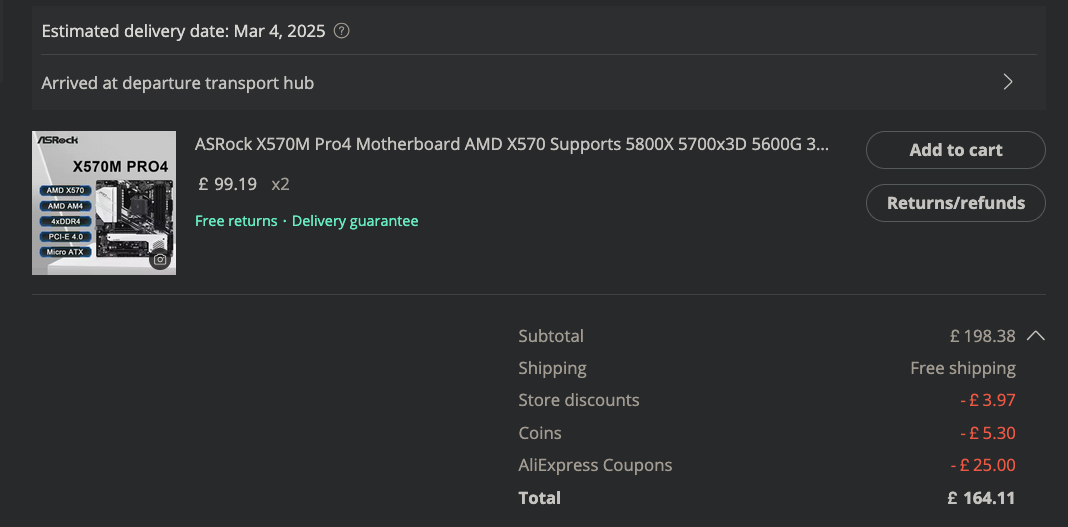 | ASRock X570M Pro4 | 2 | AliExpress | £82.05 | £164.11 |