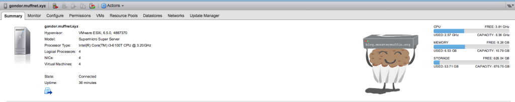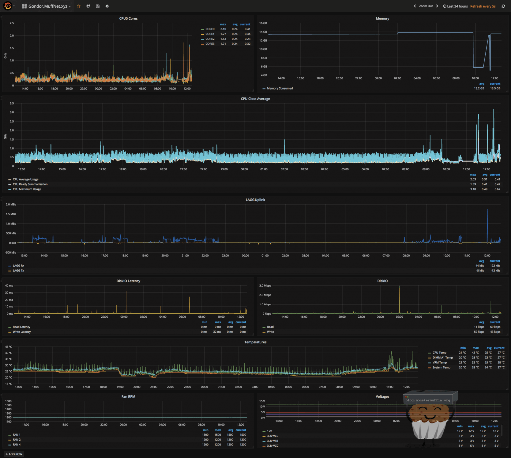 My scripts for polling vCenter started collecting stats on the host as soon as it was added and after some quick adjustments to my templates I had a fully working dashboard setup for this host (the latency screenshot above is actually from this.) I used the same script as I use for my other hosts to pull IPMI info using ipmitool which spat out some temperature and voltage information. Unfortunately, host power can’t be obtained like this because of the PSU used, I’m not even sure if this motherboard supports PMBUS.