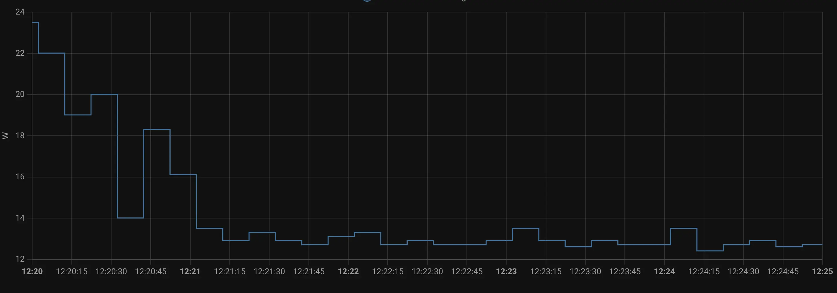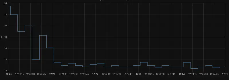 The power usage when booting up is about 24w but quickly settles down once booted, which is about 45~ seconds.