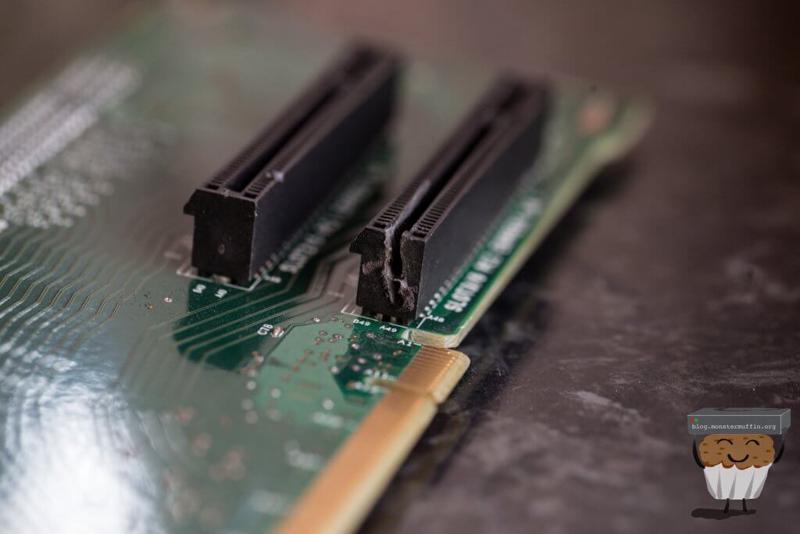 Here are some pictures of what the risers looked like in the riser cage, it all looks a bit like a clusterfuck but it all fits and works as planned. I managed to put 2 of the cards in the x16 slots (electrically x8, however) but had to cut open one of the x8 sized slots for one of the cards as you can see below. This is perfectly fine as you can see those pins on the card don’t actually go anywhere anyway, as you can see here.