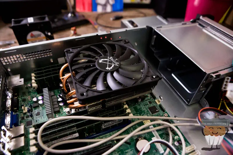 It turns out the standard BeQuiet! fan was a hair too tall for the lid to go on properly, like, 3mm to tall, so I had to improvise. I found a slim 120mm fan by Sythe in my spare parts and this was perfect. In fact, I didn’t even think about restrictive airflow when building in a 2U with this type of cooler, so this fan not only allows the top to go on but allows some space to channel air, much better.