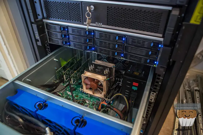 Just a word of warning to anyone that wants to build similar systems, these things are heavy. Even without disks it’s a giant PITA to rack when there are components inside the case and the rails are shitty, cheap generic ones. If you can, have another person to help you, my girlfriend normally helps me out.