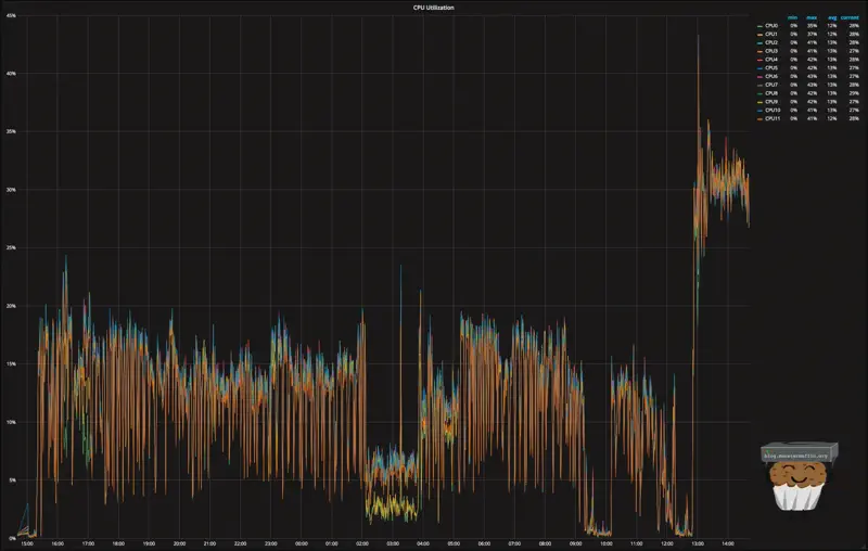 All in all, I’m very happy with the build. The CPU was also a good choice in my book as it seems to be handling everything I need it to with ease. Here is a 24 hour overview of the CPU usage with my render farm dumping to the disks and scrubs taking place, with Plex reading files: