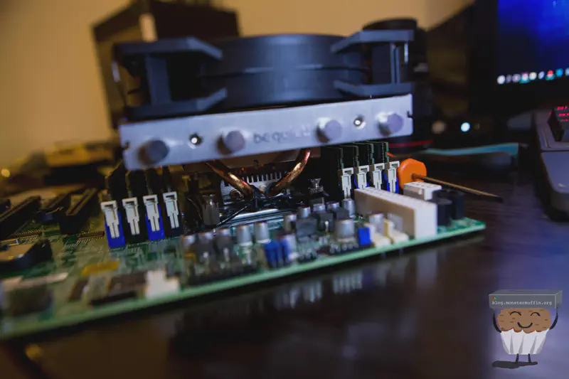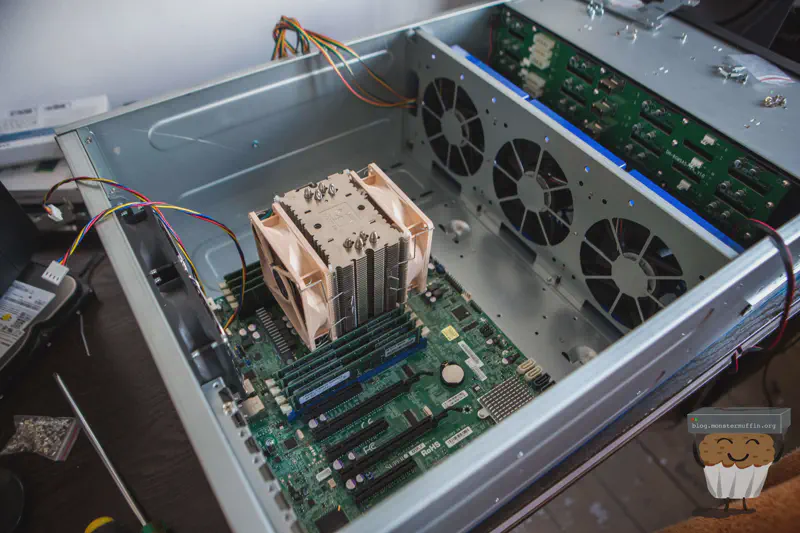 It turns out the standard BeQuiet! fan was a hair too tall for the lid to go on properly, like, 3mm to tall, so I had to improvise. I found a slim 120mm fan by Sythe in my spare parts and this was perfect. In fact, I didn’t even think about restrictive airflow when building in a 2U with this type of cooler, so this fan not only allows the top to go on but allows some space to channel air, much better.