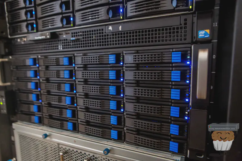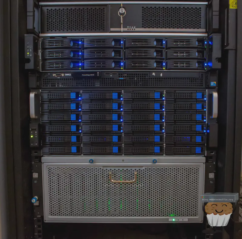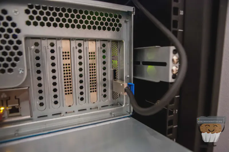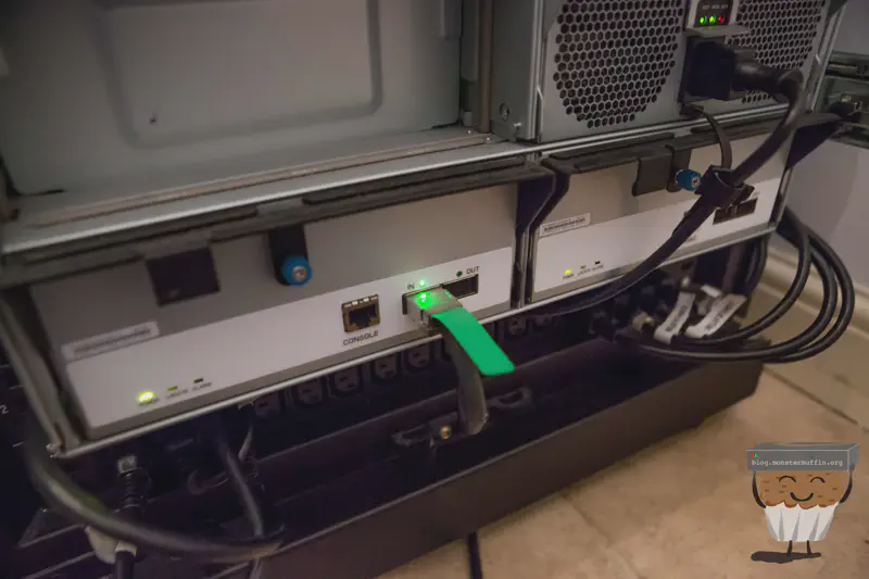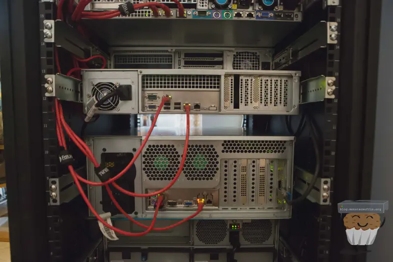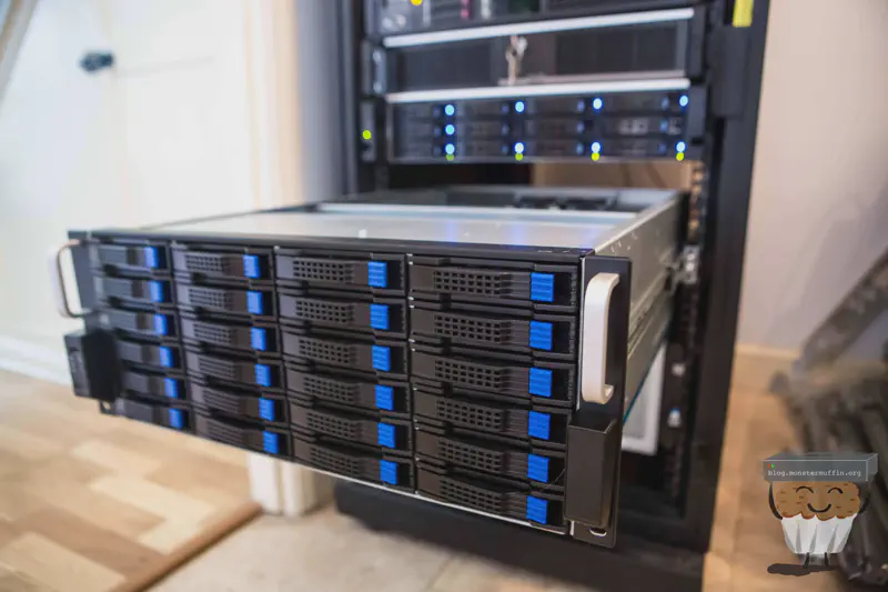 The storage server sits above the 60 bay, as that thing is a beast and below MUFFSTORE02 which is currently filling up with 8TB disks. Here’s a look at it from the back: