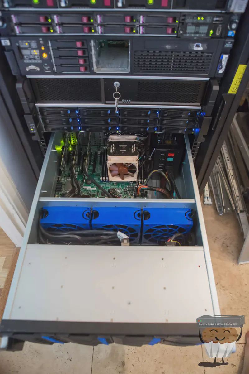 Just a word of warning to anyone that wants to build similar systems, these things are heavy. Even without disks it’s a giant PITA to rack when there are components inside the case and the rails are shitty, cheap generic ones. If you can, have another person to help you, my girlfriend normally helps me out.