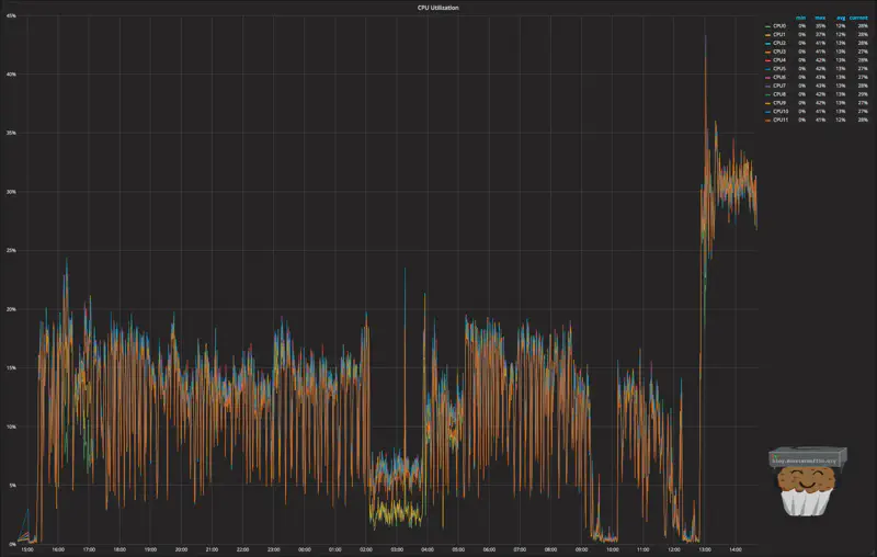 All in all, I’m very happy with the build. The CPU was also a good choice in my book as it seems to be handling everything I need it to with ease. Here is a 24 hour overview of the CPU usage with my render farm dumping to the disks and scrubs taking place, with Plex reading files: