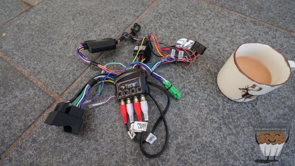 After ordering the correct Audi ‘Quadlock’ to ISO connectors I installed the unit and was pretty impressed, but the speakers had awful alternator whine and when using the headlights it was impossible to ignore the high-pitched screeching through the speakers. I opted for a high to low-frequency converter instead of using the RCAs on the back of the head unit and this has worked well. Below is the finished loom for the head unit including the high-to-low converter spliced in.