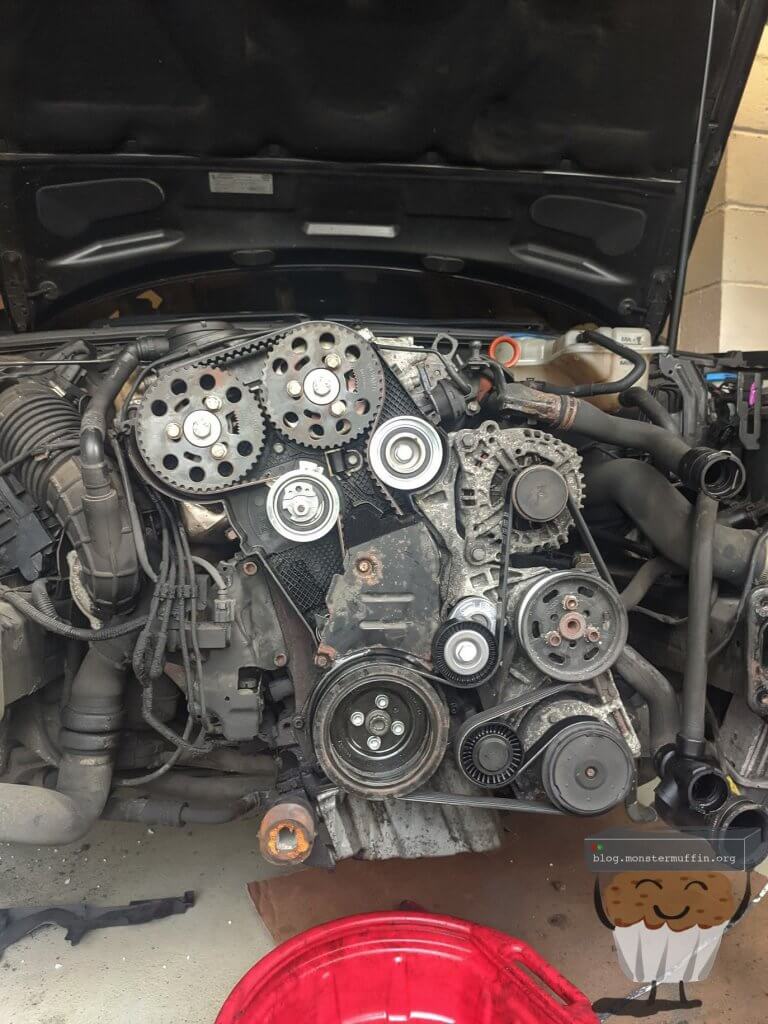 Owing to the engine’s longitudinal placement the entire front end had to be removed to get to the belts. After all was done - the belts, water pump, tensioner, and one idler were changed, after which she was purring like a tractor.