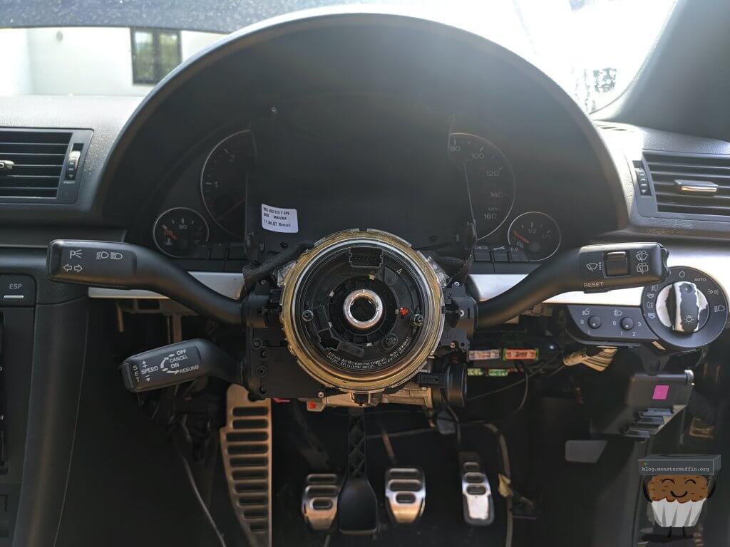 The things to remove come out easily, as long as you have the right tools. Once this is done it’s a piece of cake. The image below shows the last step before putting the steering wheel back on, you can see the cruise stalk on the bottom left.