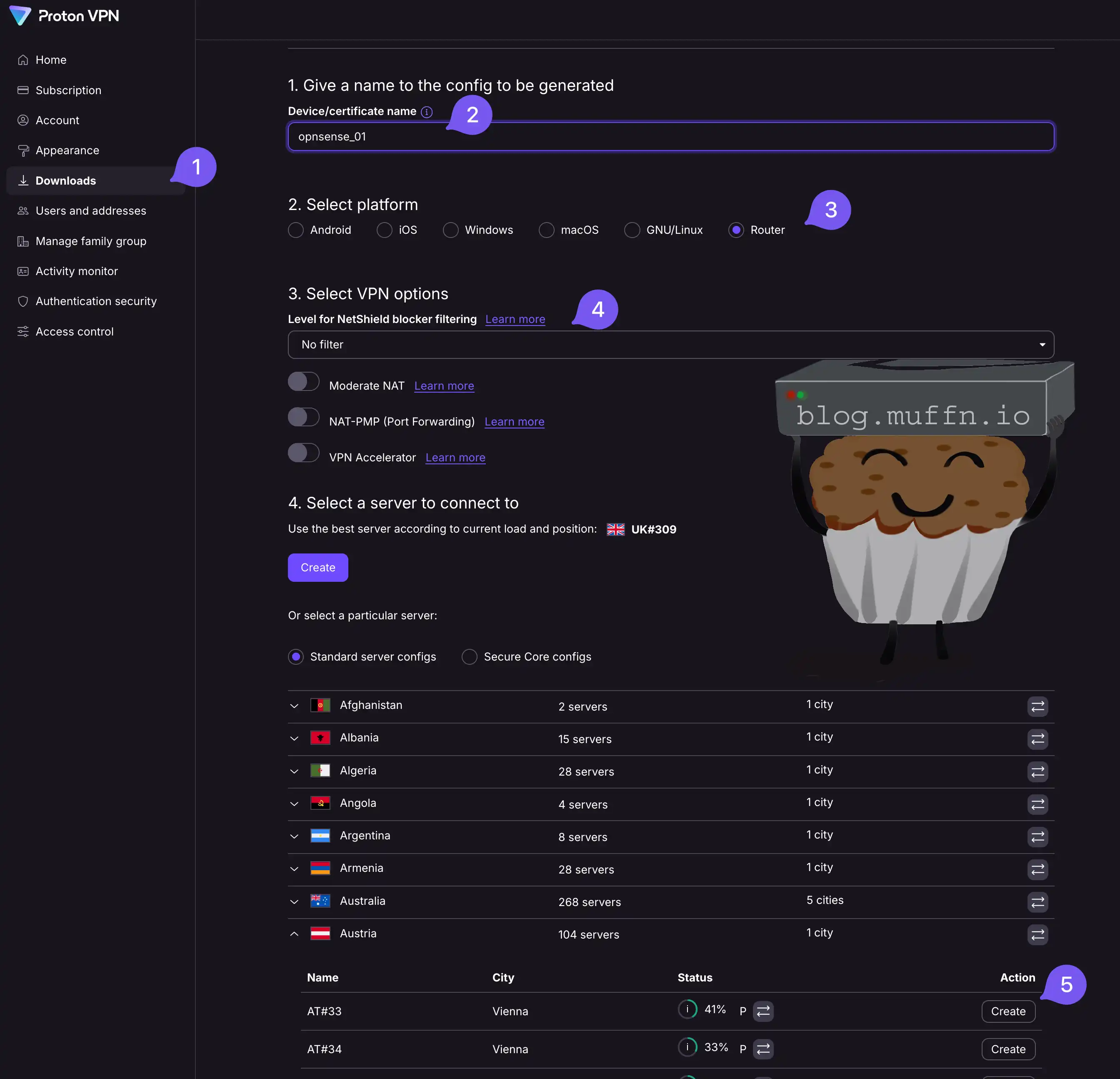 To create a WireGuard configuration file, login to the ProtonVPN web interface and follow the following steps: