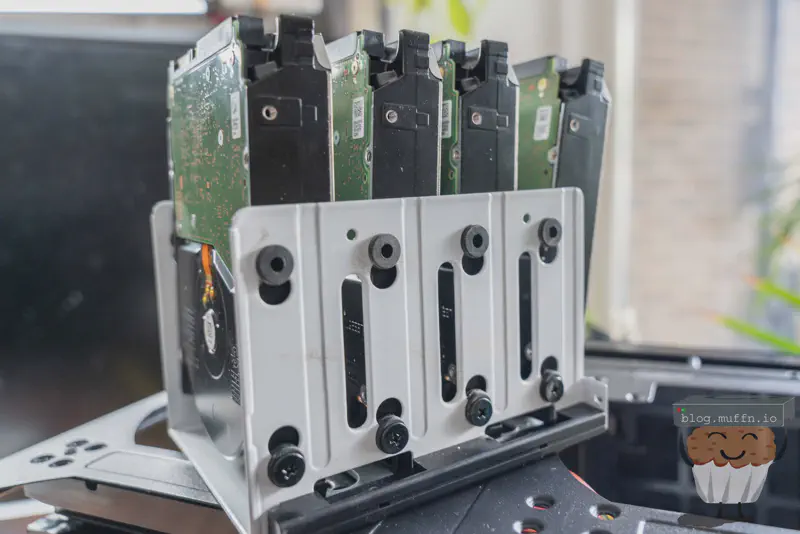 I had originally planned to get 18TB drives which would have cost me around £1.5k by themselves for around the same amount of storage (obviously with less drives). As luck would have it one of my mates had a handful of 14TB shucked drives which she was willing to part with for mates rates. At £100 a drive this was a no-brainer, so I took her up on it and took all 6 she had.