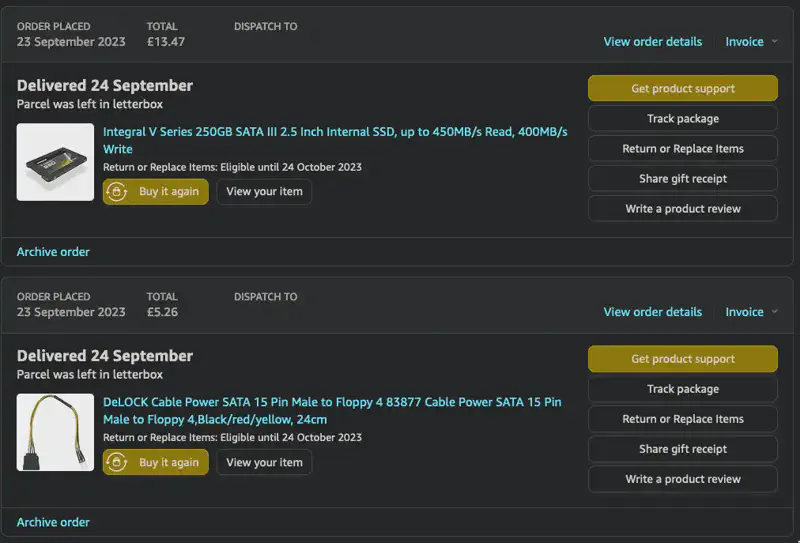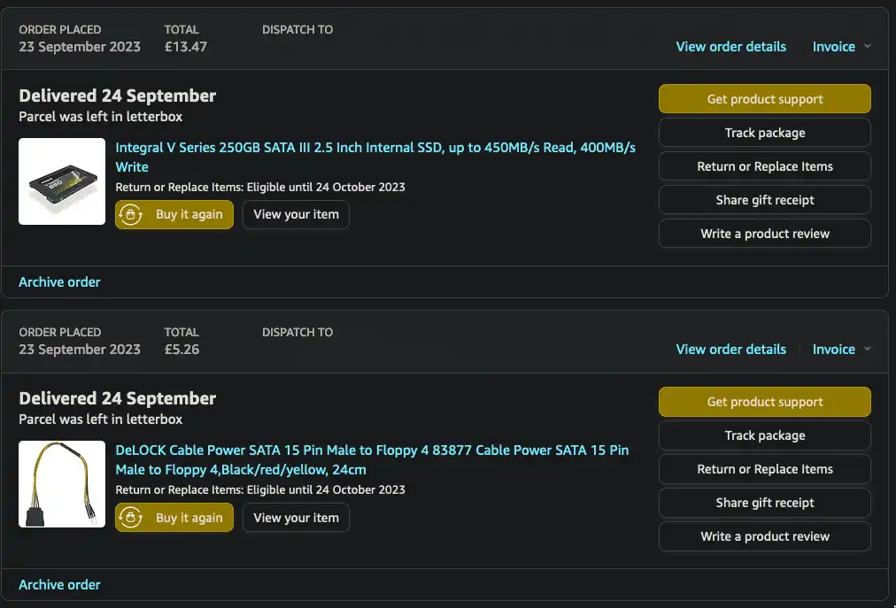 | Startech SATA Power Splitter | 2 | Amazon | £5 | £10 |