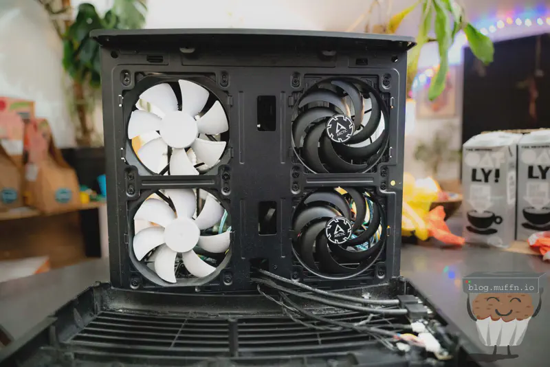 I realised that I probably needed more cooling in the case for the drives, and the fan that was already in there was not optimally placed. I got a pack of 3x Arctic P12 Slims which are fans with good static pressure, ideal for pushing air through the drive stacks.