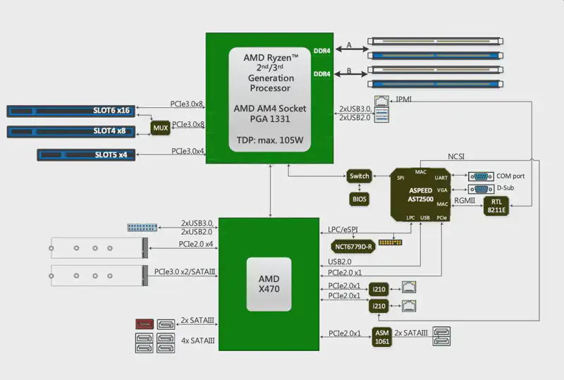 According to the block diagram, the ASM1061 SATA ports are the bottom two, with the 6x X470 ports being the 4 blocked together, along with the 2 facing outwards. The block diagram in the manual was the only place where this was clearly indicated, which isn’t all that helpful as the only indicator this is the case is the red port, the red one being for use with powering a SATADOM if required by setting a jumper directly below it.