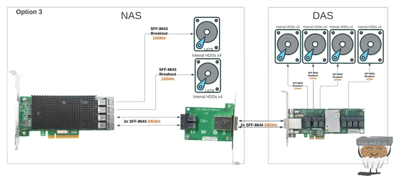 Where my NAS currently stands is kind of the way there, with a Startech adaptor which takes up to 2x SFF-8643 and converts this to allow for 2x SFF-8644 to be connected to the HBA externally. At the time of writing, the Startech adaptor is mounted, the HBA I am using is the original SAS9300-8i which is currently connecting the 2x hangers of 8x drives in the NAS.