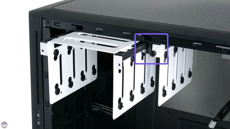 These drive hangers are ‘hung’ from two ‘rails’ on the inside of the case. The rails are held in place by two screws each. In total there are 3 rails, with the center rail holding both of the drive hangers and the outside rails holding the outside of each drive hanger.