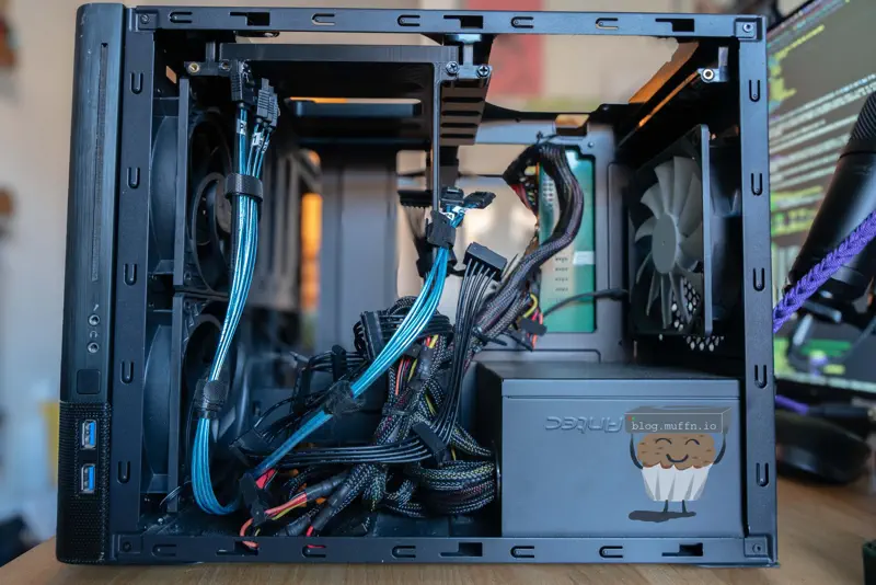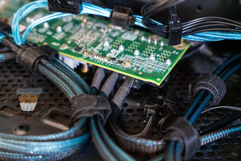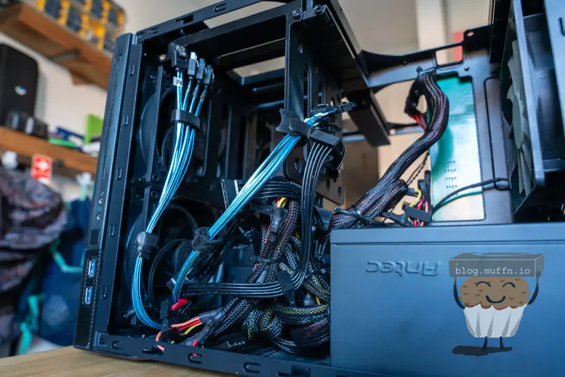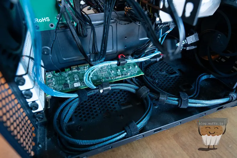 Putting everything together is straightforward. I made sure to connect and route all the cables for future disks. With everything in looms, adding more disks in the future just means slotting them into the hanger and the relevant cables are already in place.