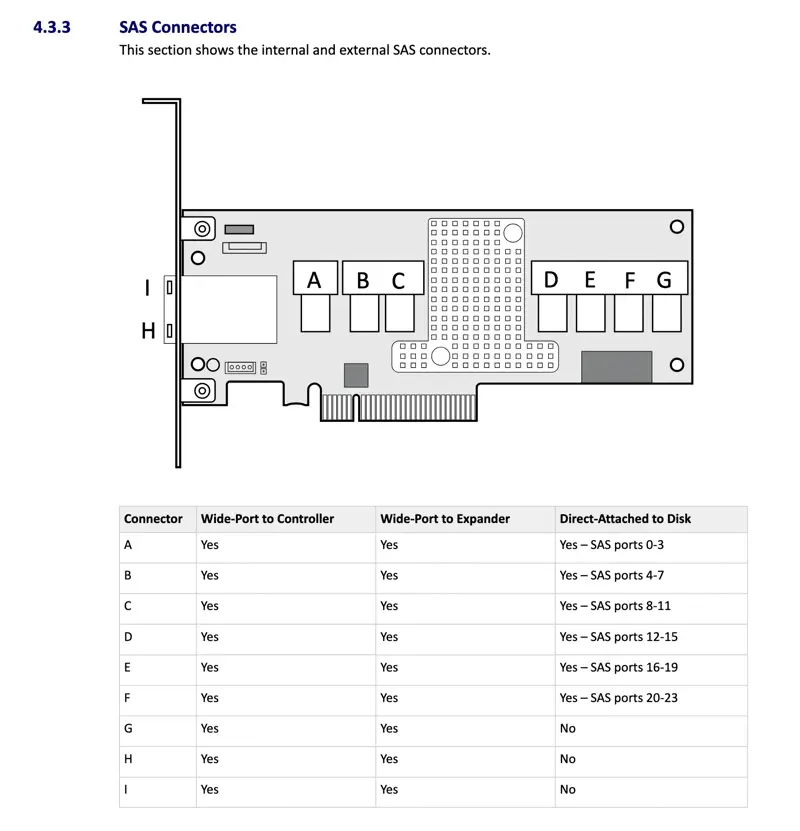 The 82885T is a godsend of a card. It’s a SAS expander2 that has 2x external SFF-8644 ports, allowing the card to be uplinked to a HBA whilst having 6x internal SFF-8643 ports to connect to the drives, which gives a total of 24x drives if not used with another expander. The cherry on top is that this card is widely available for cheap.