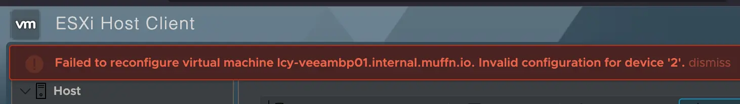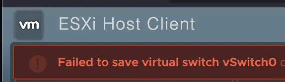 Next steps here are to change the interfaces on the VM from a vDS switch to vSS, which is fine if you have that ready to go; I did not. This is where I encountered issues. Trying to add NICs to the vSS kept giving me this error: