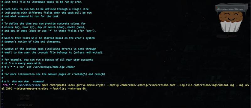 0 */6 * * * /usr/bin/rclone move gdrive-media-crypt: --config /home//.config/rclone/rclone.conf --log-file /upload.log --log-level INFO --delete-empty-src-dirs --fast-list --min-age