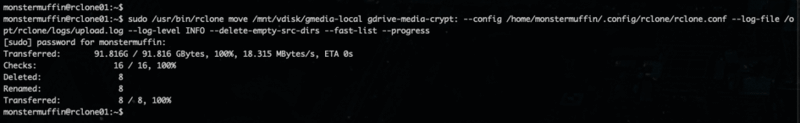 Getting your local data into GD from your local mount is easy enough, I’m doing this via a simple crontab job that runs every 6 hours but there are many scripts out there to do more fancy stuff, however with the rclone move flags I see no need for this.